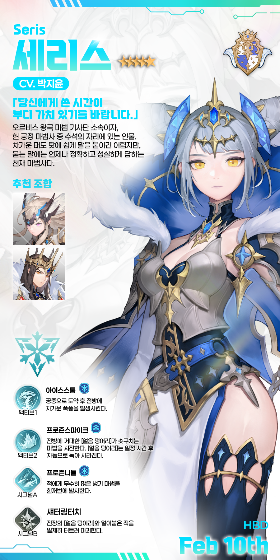영웅 이름 | 세리스(Seris) | 생일 | 2월 10일 | 소속 | 오르비스 왕국 | |