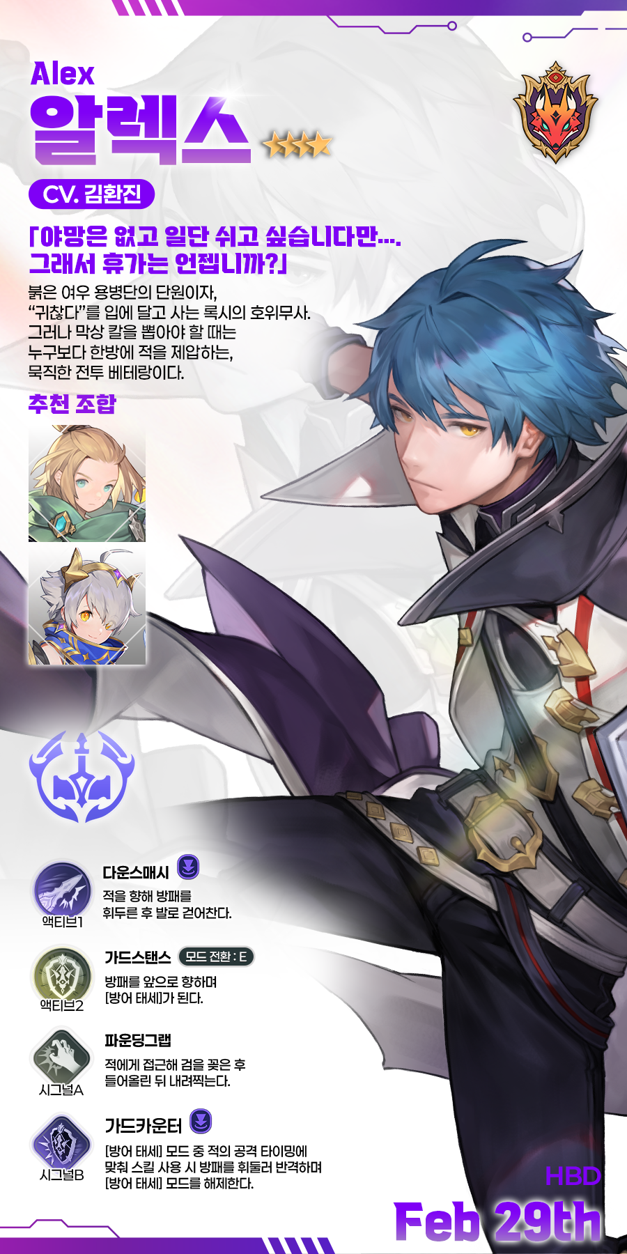 영웅 이름 | 알렉스(Alex) | 생일 | 2월 29일 | 소속 | 붉은 여우 용병단 |
