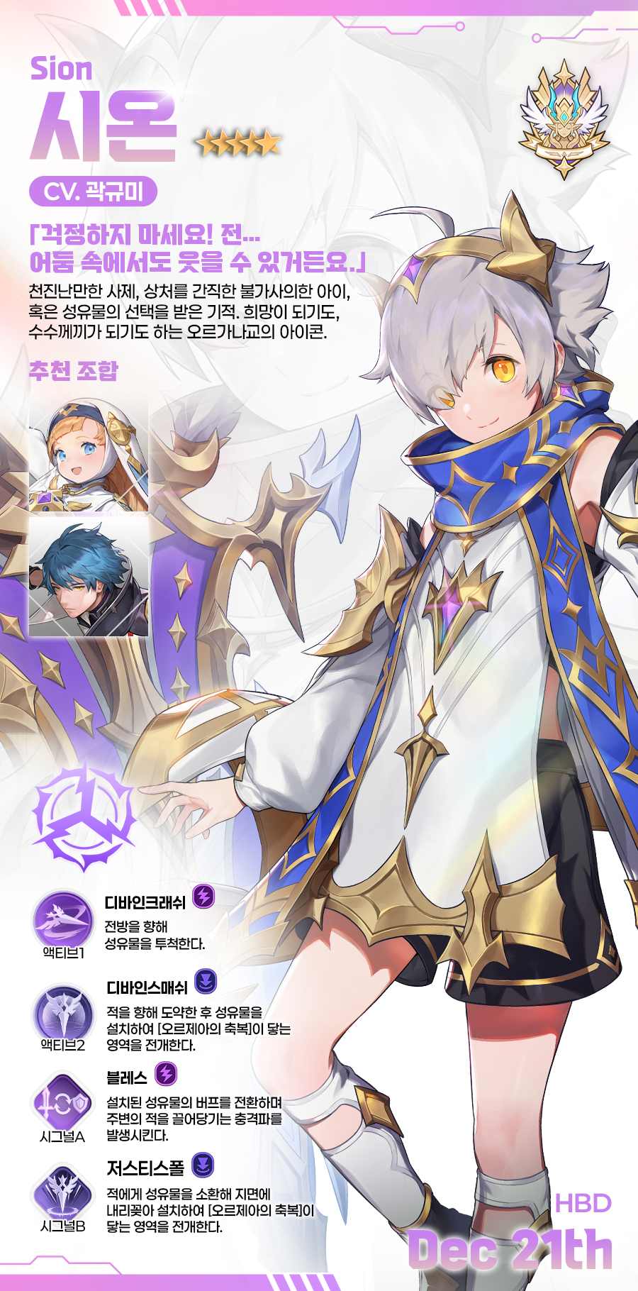 영웅 이름 | 시온(Sion) | 생일 | 12월 21일 | 소속 | 오르가나 교단 | |