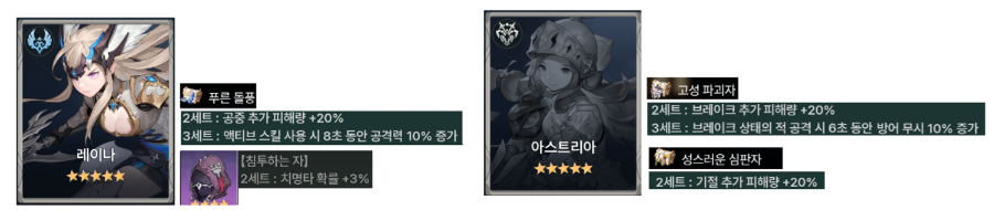 카스텔라는 기절 2세트에 대지분쇄자(다운)3세트 해야 맞는거 같습니다. 시그널스킬이 주 딜량이기에 브레이크는 강인함 다까인후의 데미지기이기에 기절과 시그널스킬의 장점이 있는 카스텔라와는 조금 다른듯합니다.