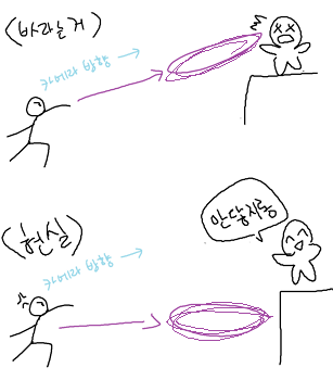 대각선 위를 바라보고 던졌다면 벽에 걸릴지언정 대각선 위로 날아가면 좋겠는데