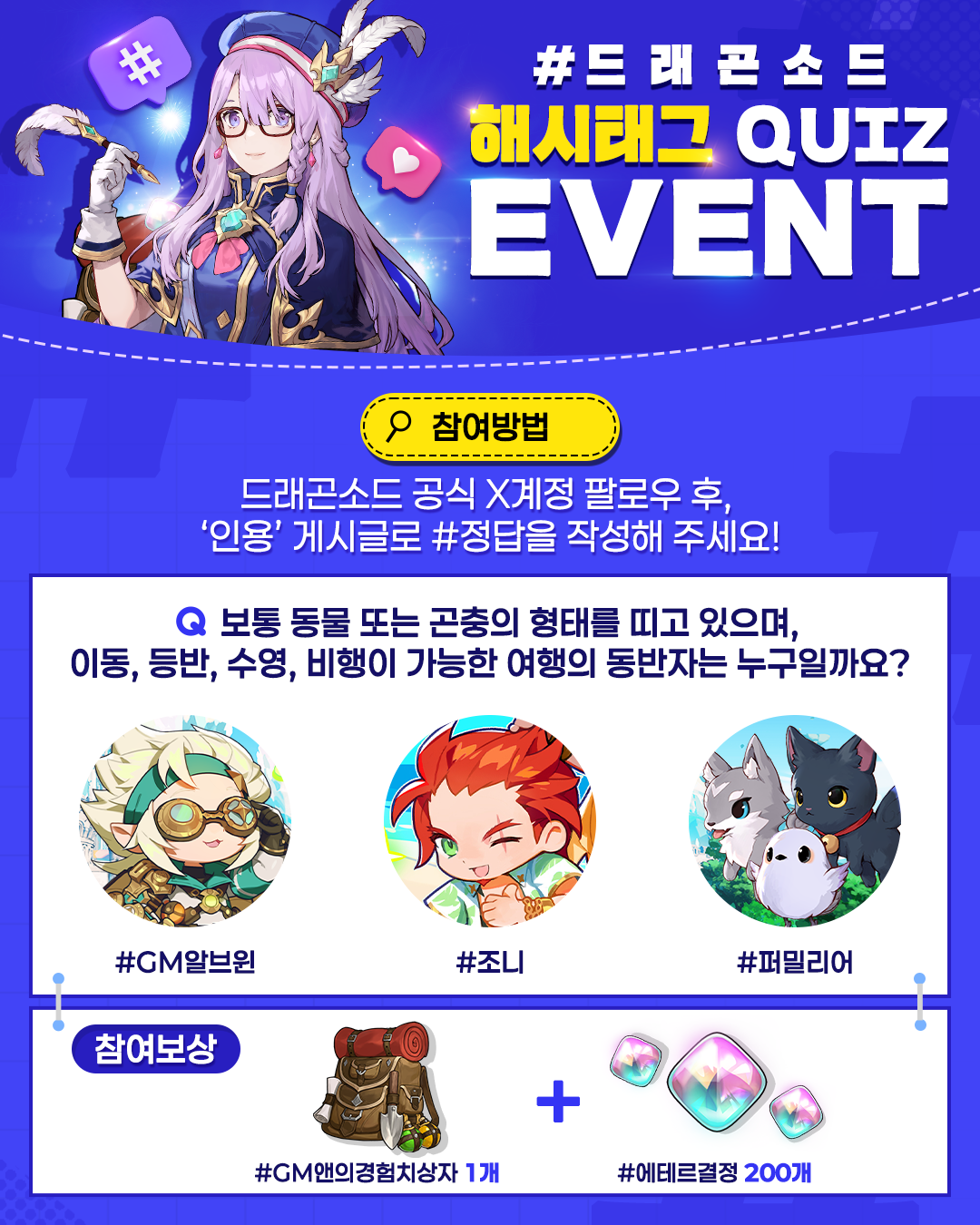 - 이벤트 게시글을 ‘인용’하여 정답을 맞추신 모험가님 중 20명을 추첨하여 특별한 선물을 드려요!