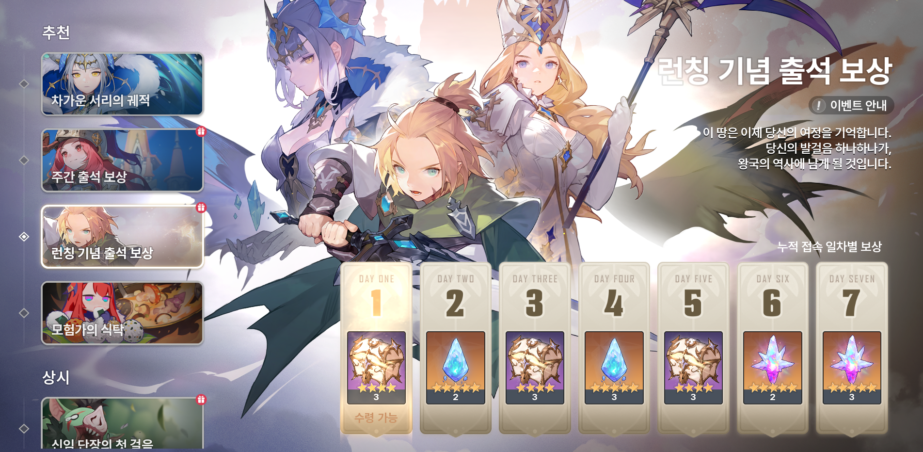 2. 런칭기념 출석보상 7일차 보상 이미지가 찬란한 여신석인데 열쇠 상자로 되어있네요 수정부탁드립니다