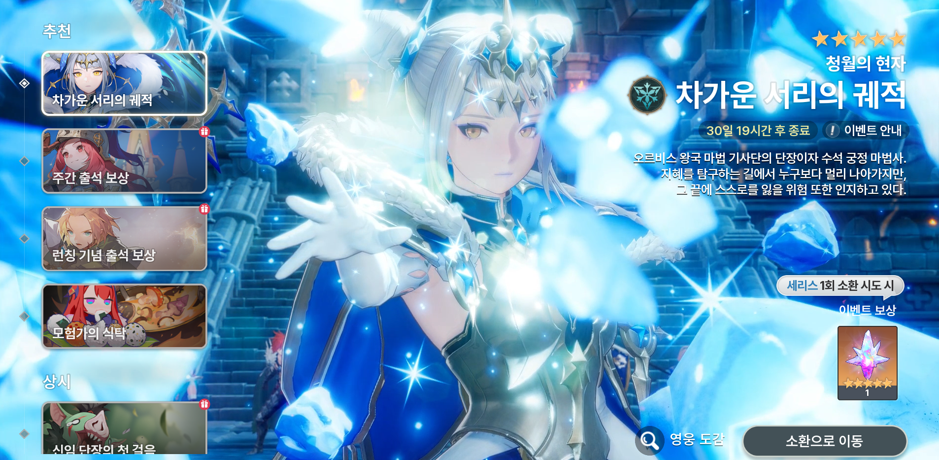 - 청월의 현자 ‘세리스’ 픽업 영웅 1회 소환 시도 시 보상을 획득할 수 있어요!