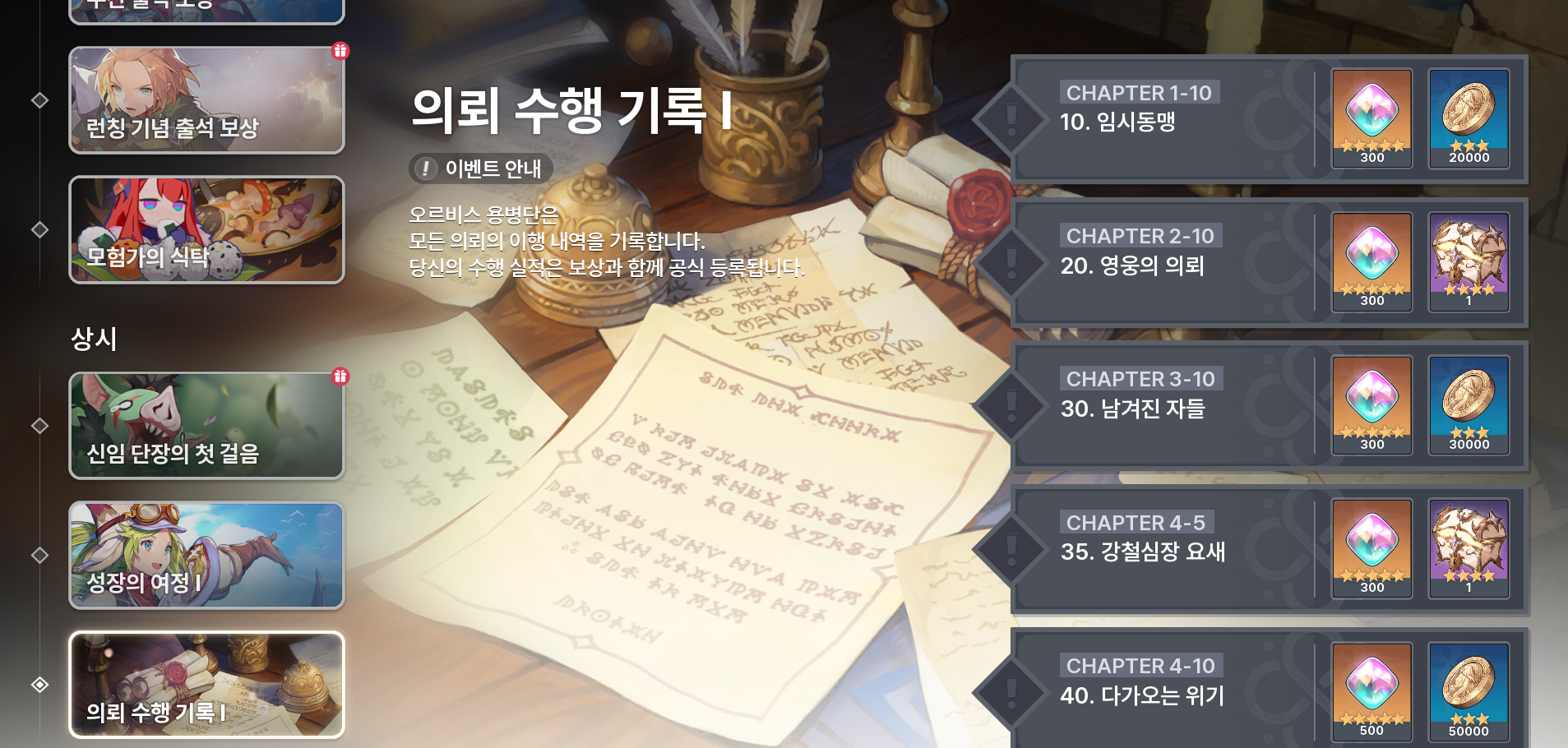 - 정해진 모험 의뢰를 완료할 때마다 보상을 받을 수 있어요!