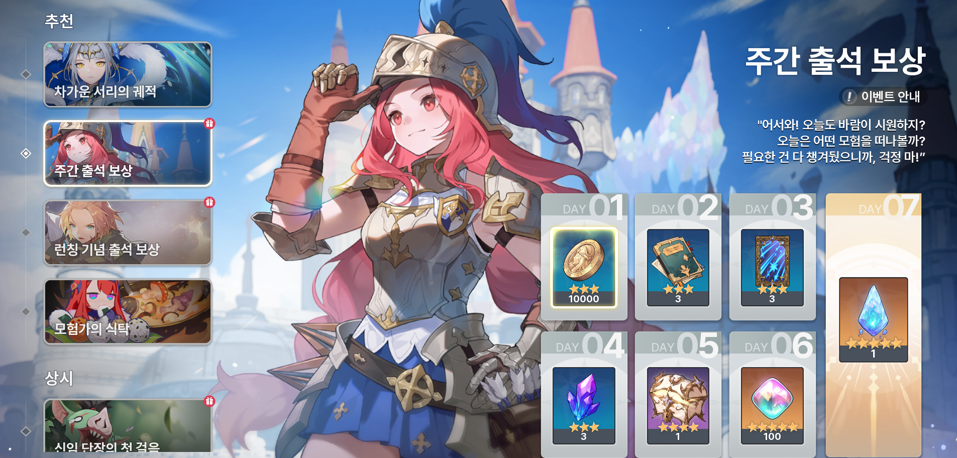 - 7일동안 매일 매일 선물을 받을 수 있어요! 월요일마다 초기화 되니 주의하세요!