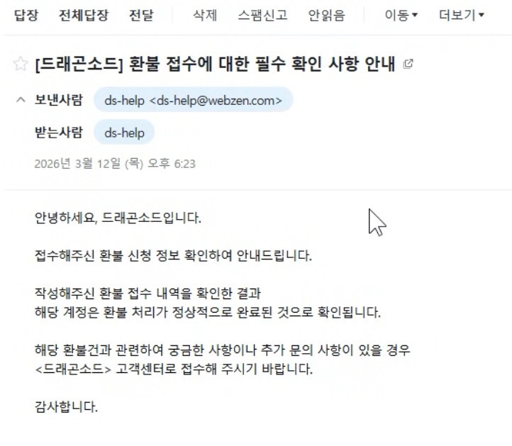 드래곤소드 환불과 관련하여 게시글을 남겨 주셨어요.