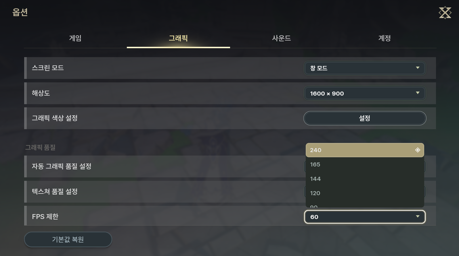 먼저, 원활한 플레이를 위해 FPS의 기본 설정을 PC [60], 모바일 [30]으로 변경했습니다.