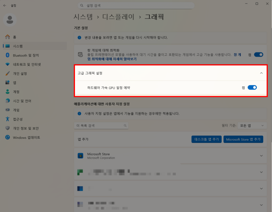 1. 하드웨어 가속 GPU 일정 예약 비활성화