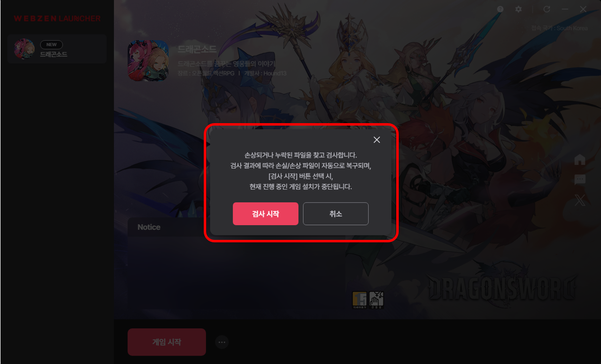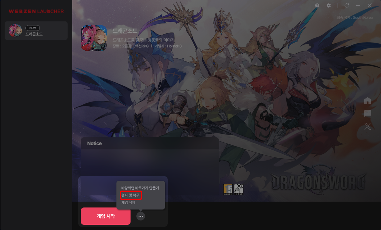 1) 웹젠 런처 실행 후 드래곤소드 게임 시작 옆 메뉴(···) 클릭