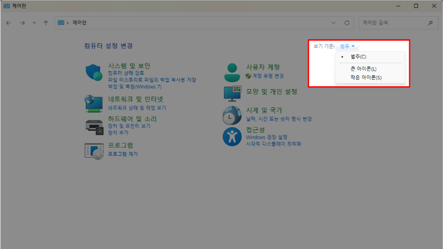 1) 제어판 → 우측 상단 보기 기준을 [범주]로 변경