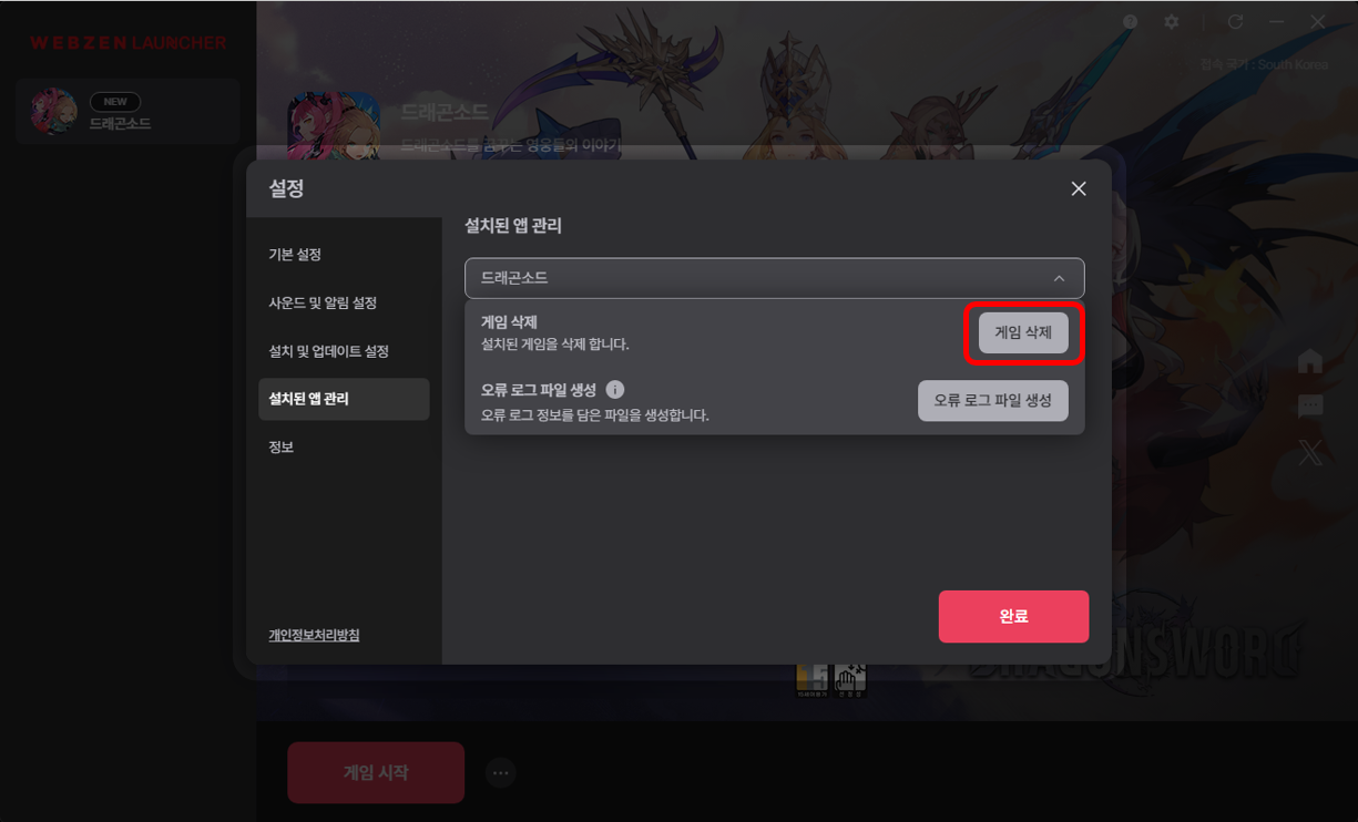 - 웹젠 런처의 [설정 → 설치된 앱 관리]에서 게임을 선택하고 [게임 삭제]를 클릭해 게임 삭제 후 재설치 진행