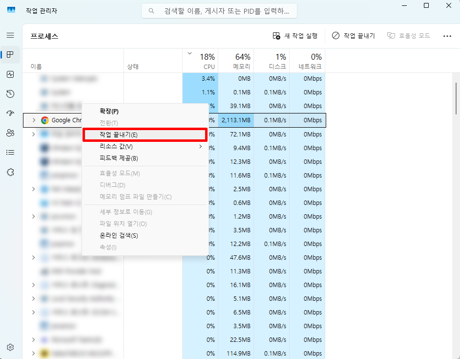 8. 작업 관리자(Ctrl+Shift+Esc)를 열어 불필요하거나 의심되는 프로그램을 종료하고 다시 시도합니다.