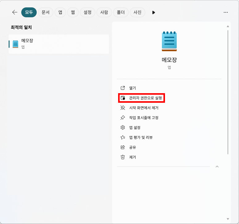 ① [검색] - [메모장] - [우클릭] - [관리자 권한으로 실행]을 통해 메모장을 실행합니다.