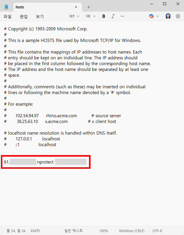 아래의 방법을 참고하여 hosts 파일을 열어 게임가드 관련 내용을 삭제해야 합니다.
