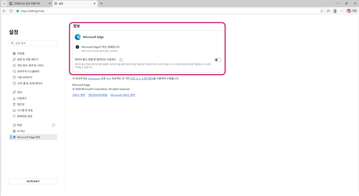 PC에 설치된 Microsoft Edge 또는 WebView2 런타임이 최신 버전이 아닐 경우 발생할 수 있습니다.