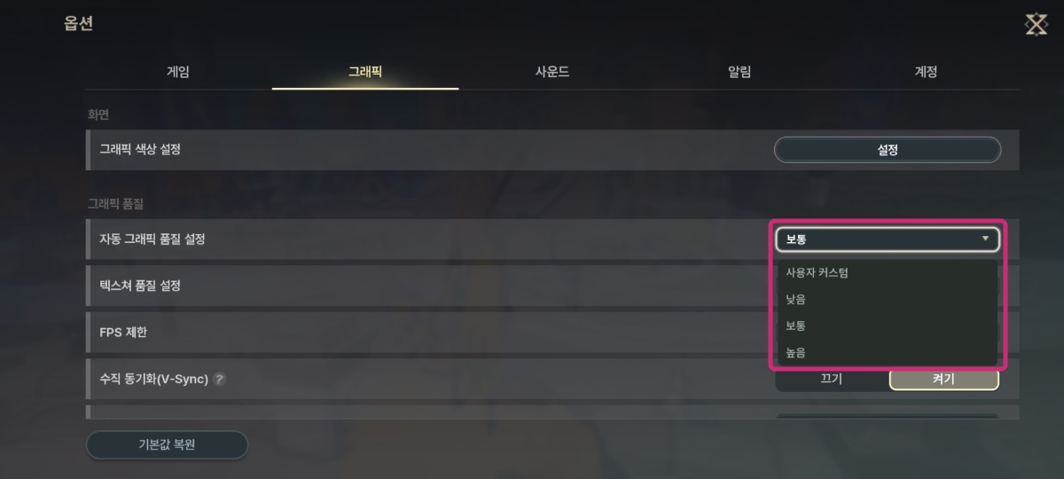 2. [ 자동 그래픽 품질 설정 ]을 현재 설정보다 낮게 설정