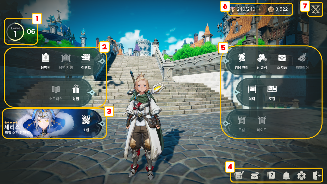 - 용병단 레벨과 이름을 확인할 수 있습니다.