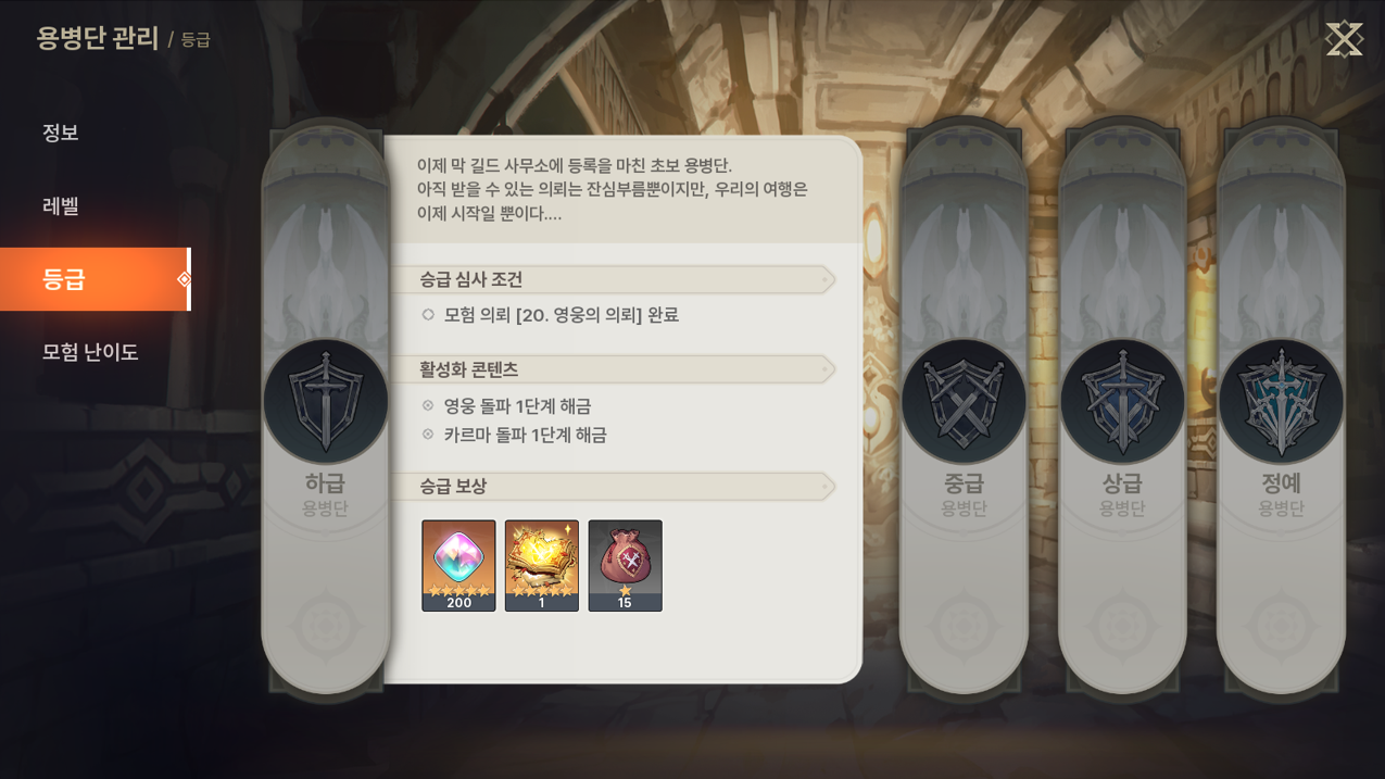 - 모험가님의 용병단 등급을 확인할 수 있습니다.- 모험 의뢰를 일정 수준까지 완료하거나, 용병단 레벨이 특정 단계에 도달하면 승급 의뢰를 진행할 수 있습니다.- 승급 의뢰를 완료하면 용병단 등급이 상승하며, 영웅 돌파와 카르마 돌파가 해금됩니다.