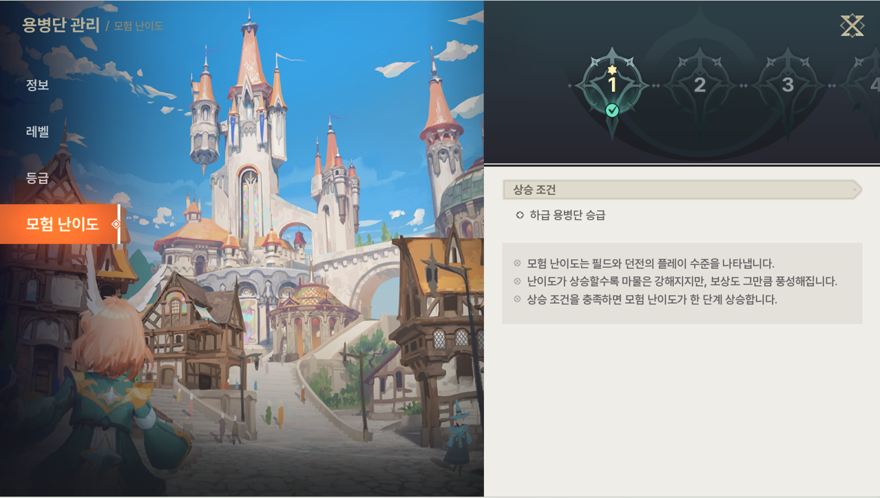 - 모험가님의 용병단 등급에 따라 모험 난이도가 상승합니다.- 모험 난이도가 높아지면 필드 마물들의 레벨이 올라가지만, 그만큼 보상 수준도 상승합니다.- 원활한 플레이를 위해 모험 난이도를 낮출 수 있습니다.
