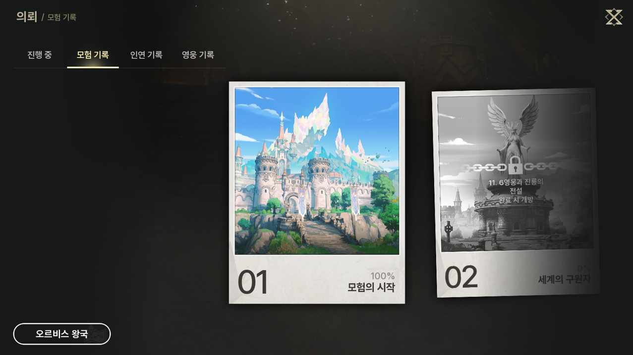 - 메뉴 > 의뢰를 통해 [모험 기록]에 대한 세부 내용을 확인할 수 있습니다.- 모험 기록을 통해 의뢰 목록, 완료한 의뢰, 진행도를 확인할 수 있습니다.- 완료한 의뢰와 대화 내용을 다시 볼 수 있으며, 의뢰 달성률에 따라 추가 보상을 받을 수 있습니다.