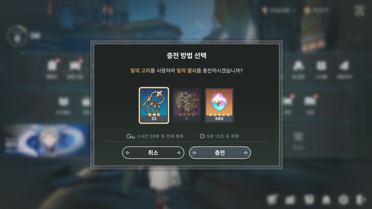 - 에테르 결정을 통한 빛의 열쇠 충전은 일일 최대 8회까지 가능하며, 충전 횟수가 증가할수록 필요한 비용이 상승합니다.