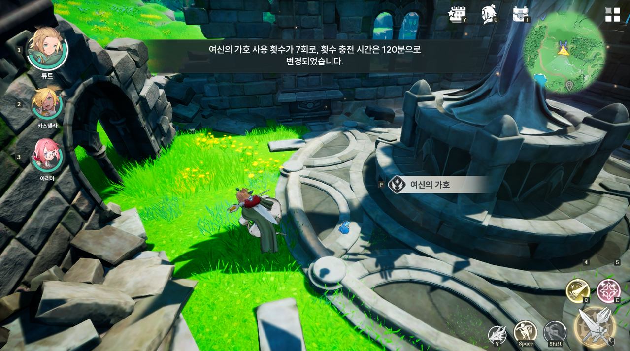 - 복원된 오르가나 석상으로 워프할 수 있으며, 여신의 가호를 사용할 수 있습니다.