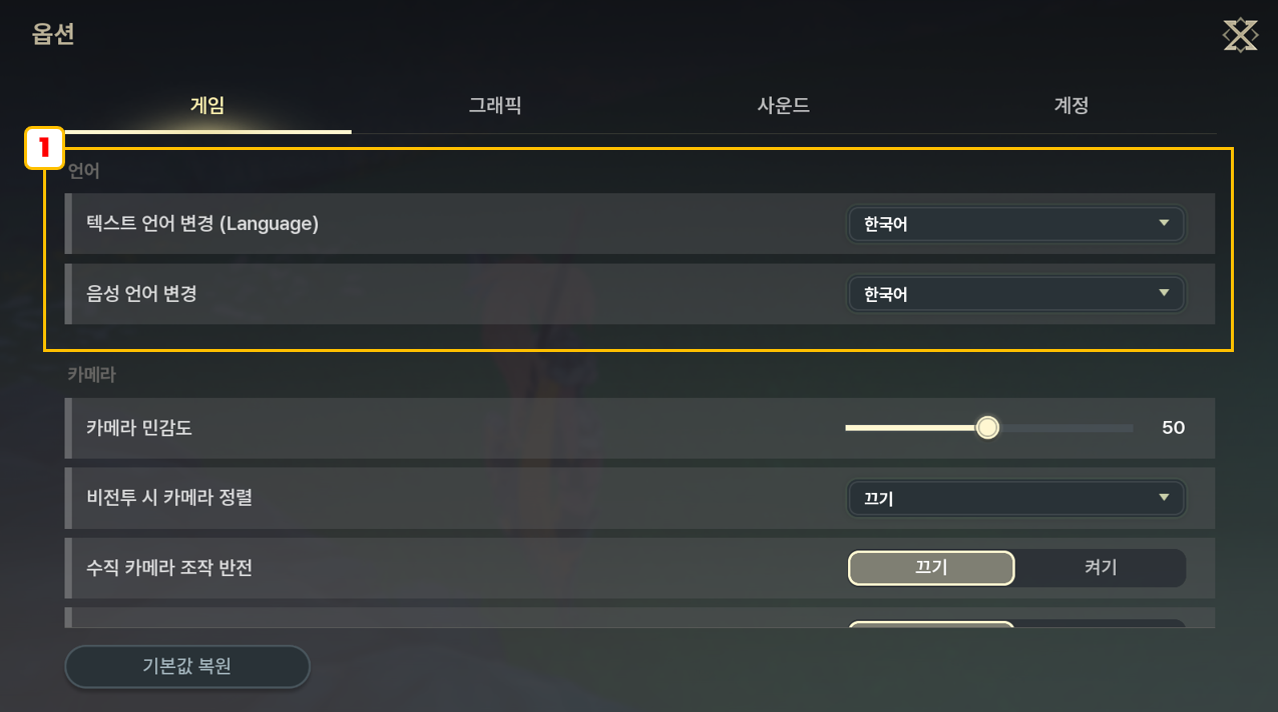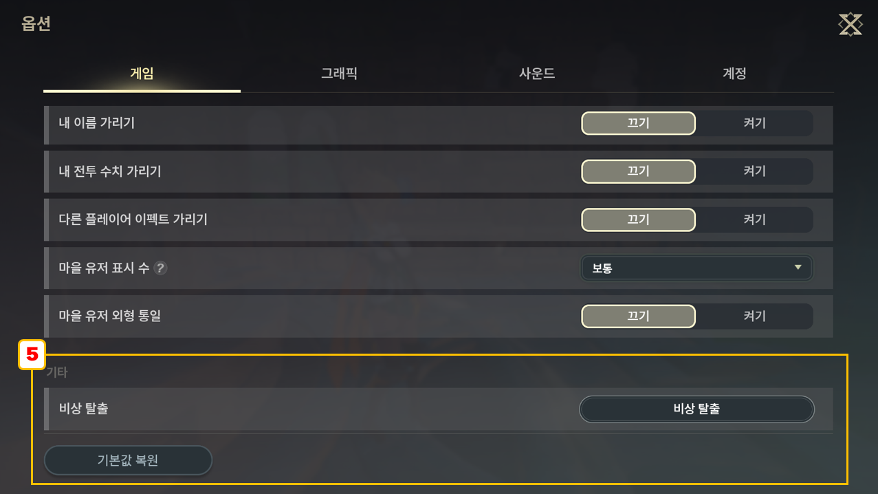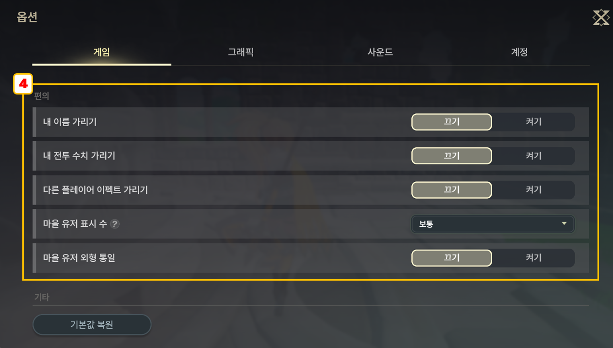 - [기본값 복원] 게임 옵션을 기본값으로 설정합니다.