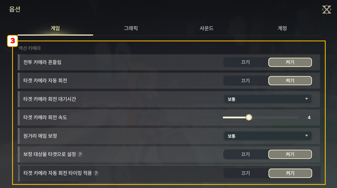 - [카메라 민감도] 화면 조작 시 게임 시점의 회전 속도를 조절하는 설정입니다.