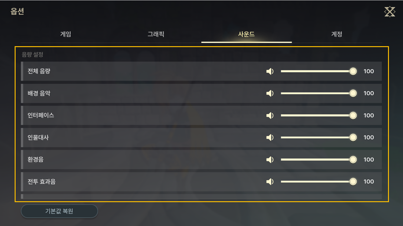 - [기본값 복원] 사운드 설정을 기본값으로 설정합니다.