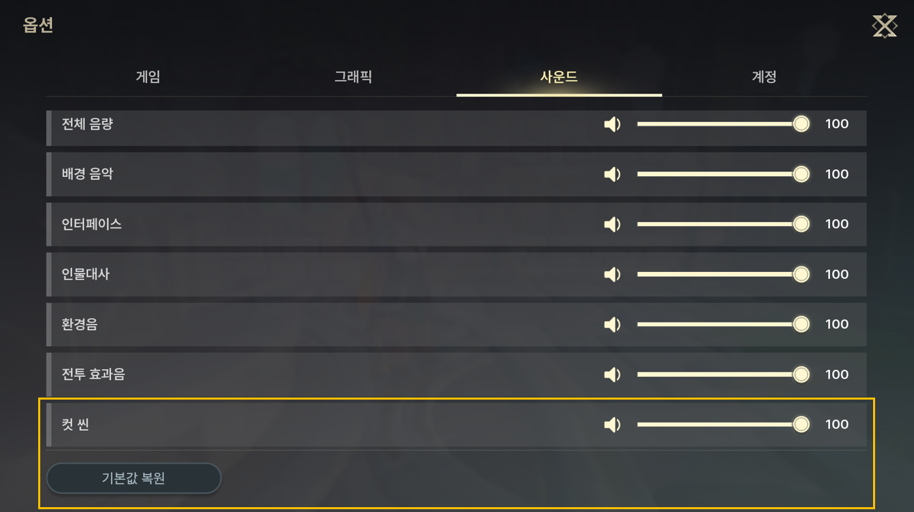 - [컷 씬] 게임 내 컷 씬에서 재생되는 음성·효과음의 음량을 조절할 수 있습니다.