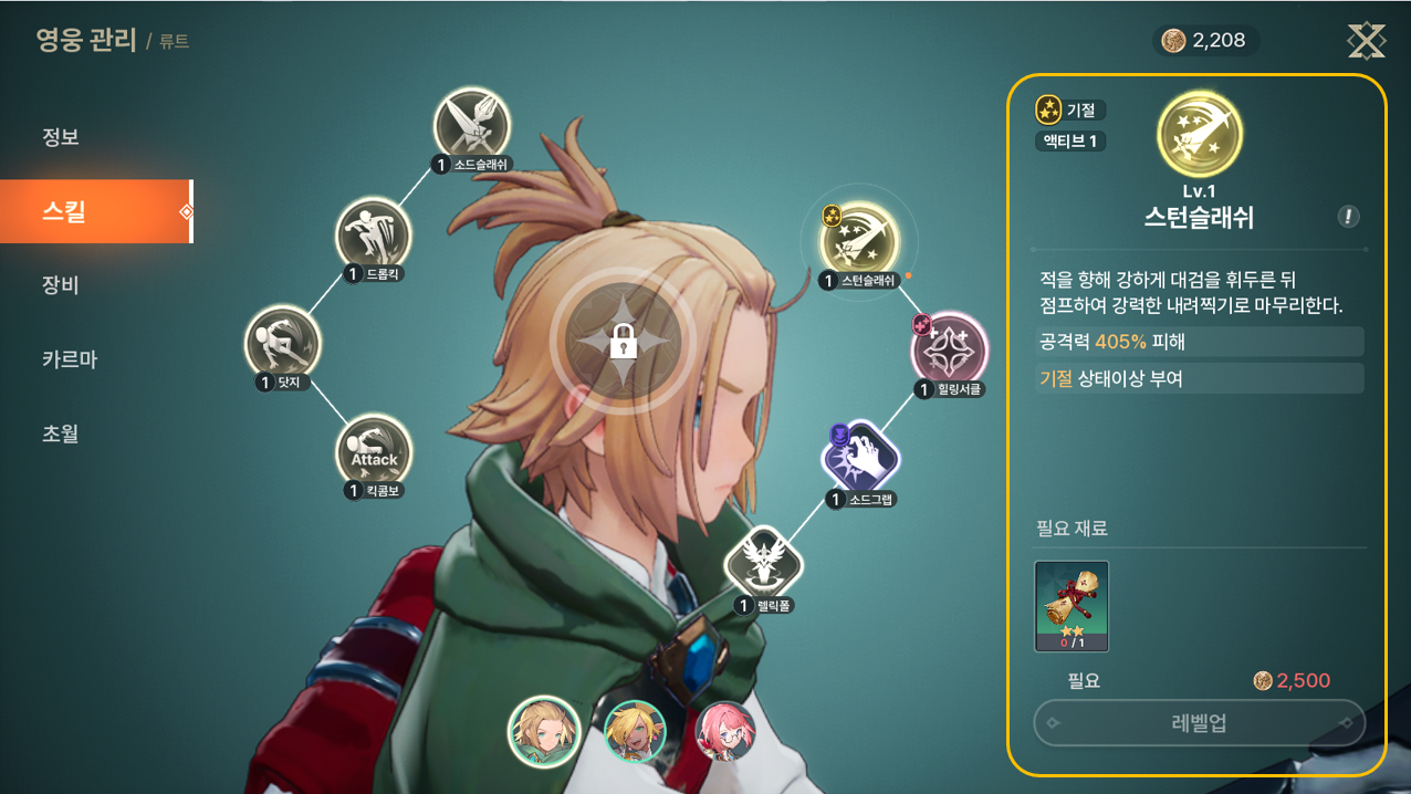 - 모험을 통해 획득한 스킬 성장 소재를 사용하여 영웅 스킬의 레벨을 올릴 수 있습니다.