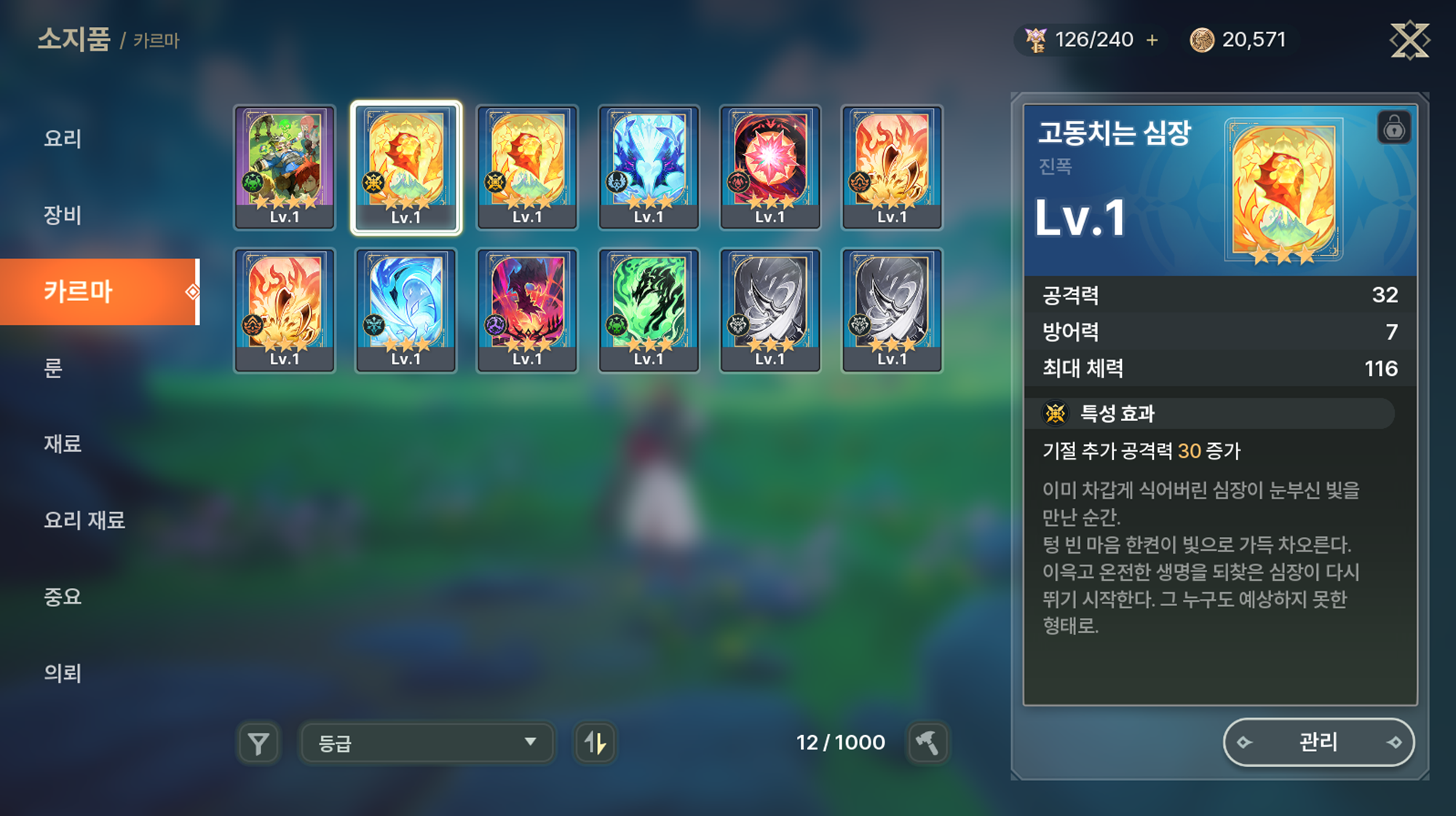 - 영웅 관리 메뉴의 카르마 탭이나,소지품의 카르마 관리 탭에서 장착/해제 및 성장이 가능합니다.