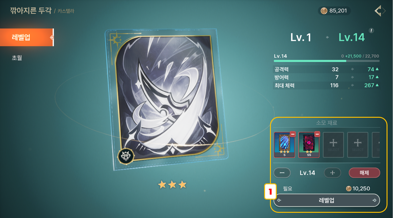 - 강화에는 아르카나를 소모하여 카르마를 레벨업 할 수 있습니다.