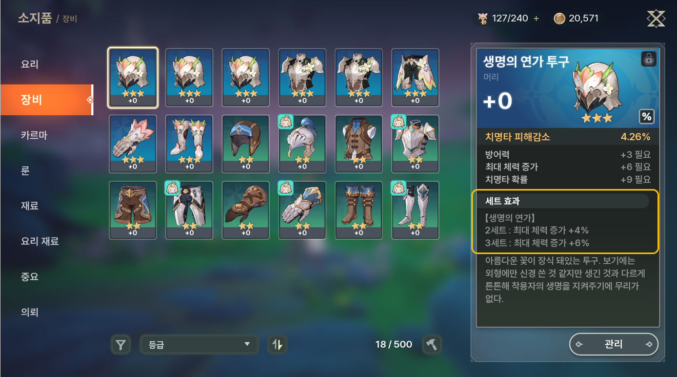 - 세트에는 2세트 효과와 3세트 효과가 있으며, 동일 세트 3개 착용 시 하위 효과도 모두 적용됩니다.