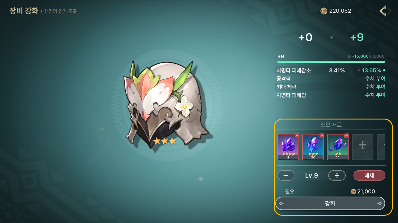 - 장비 성장 소재인 마력의 결정 또는 일반 장비를 소모하여 장비 강화를 진행할 수 있습니다.