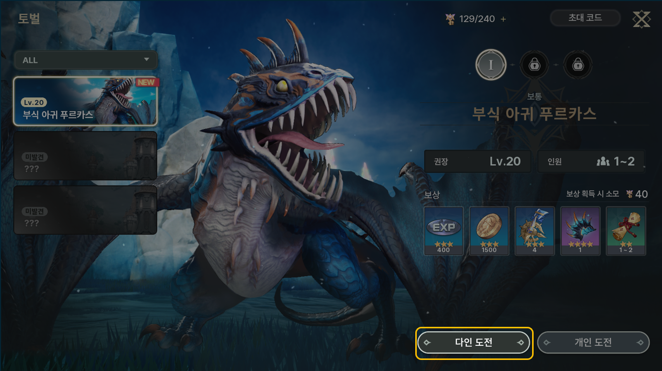 - 다인 도전은 랜덤한 모험가님과 매칭되어 빠른 도전을 진행하거나, 방 생성 후 초대 코드를 입력한 모험가님과 같이 진행할 수 있습니다.