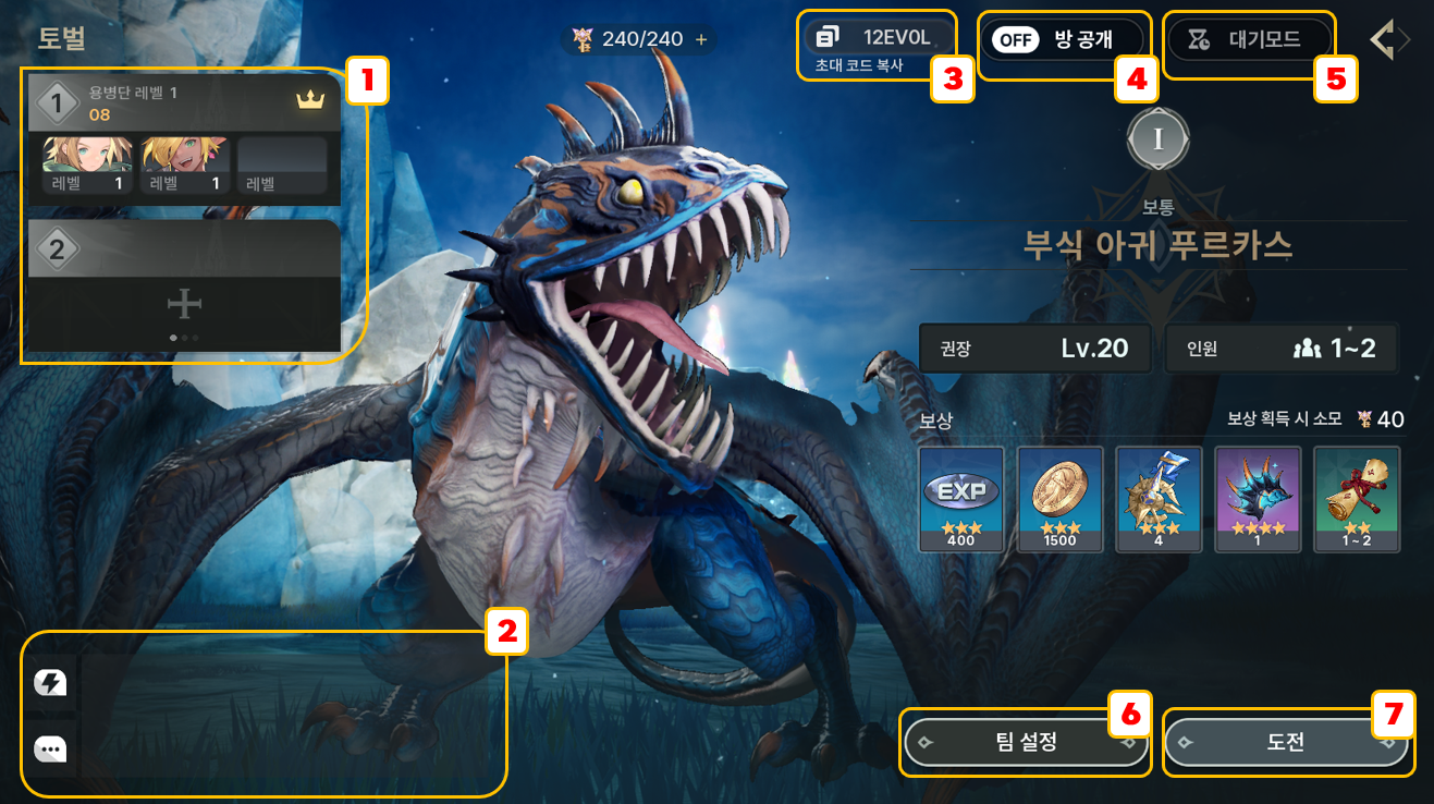 - 준비가 완료되었다면, 파티장을 통해 토벌 다인 도전 전투에 입장할 수 있습니다.