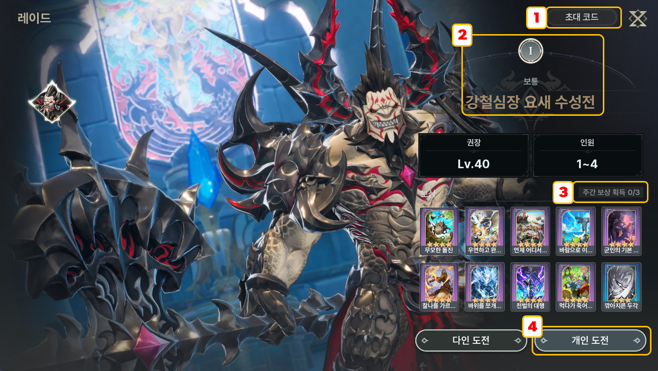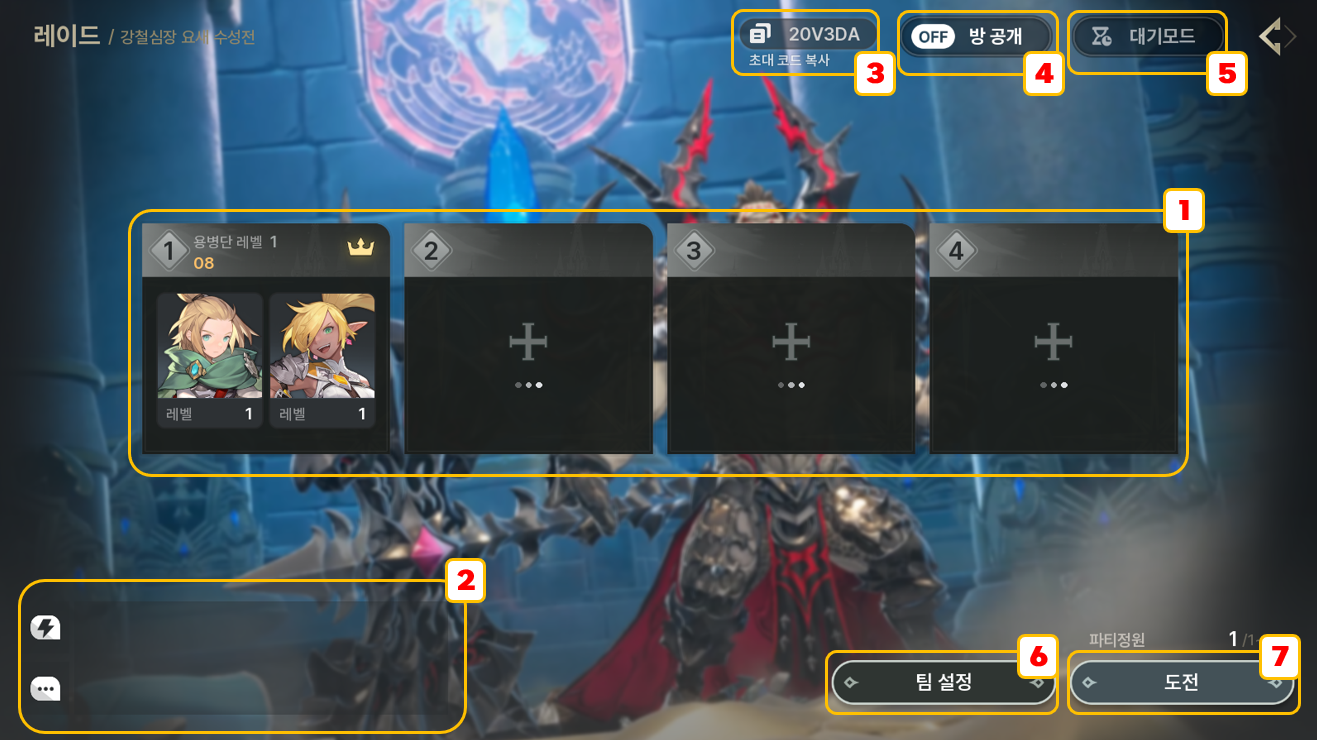 - 준비가 완료되었다면, 파티장을 통해 레이드 다인 도전 전투에 입장할 수 있습니다.