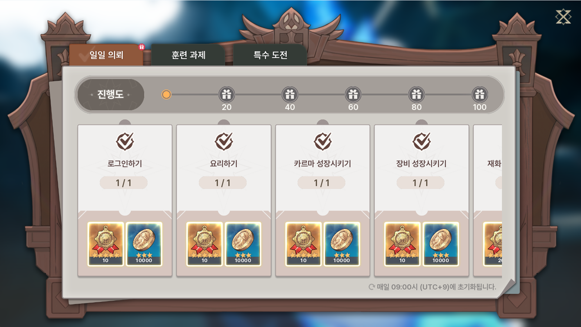 - 매일 반복 진행할 수 있는 의뢰를 수행합니다.- 완료 시 달성한 진행도에 따라 용병단 경험치, 재화, 성장 재료, 행동력 회복 아이템 등을 보상으로 획득할 수 있습니다.- 일일 의뢰는 매일 09:00 (UTC+9)에 초기화됩니다.