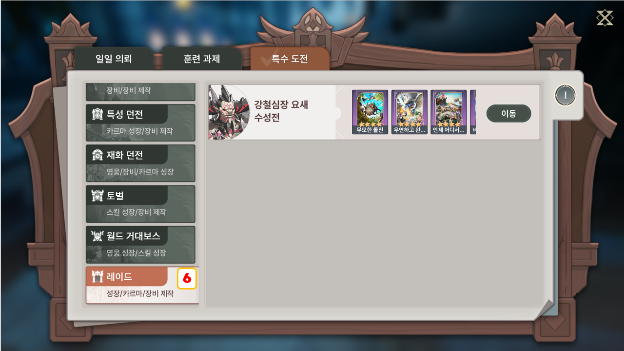 - 다양한 콘텐츠의 보상 정보를 확인하고, 위치 추적 기능을 통해 편리하게 접근할 수 있습니다.① 일반 던전-클리어 보상으로 영웅 장비와 영웅 강화 재료를 획득할 수 있습니다.② 특성 던전- 성장 및 제작에 필요한 특성 재료 획득③ 재화 던전- 경험치 재료 등 각종 재화 획득④ 월드 거대 보스- 스킬 및 카르마 성장 재료 획득⑤ 토벌- 스킬 재료 및 강화 재료 획득⑥ 레이드- 카르마 및 룬 또는 카르마 성장 소재 획득