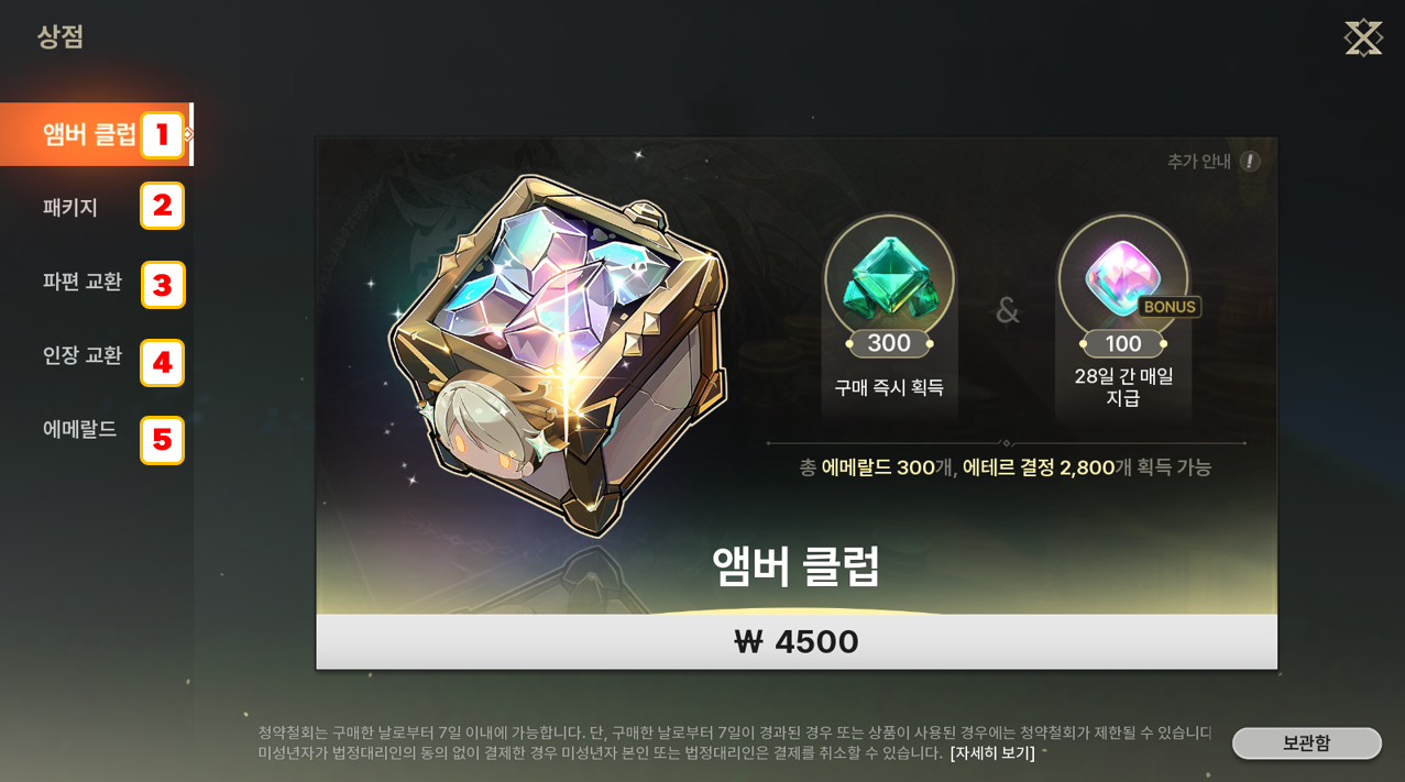 - 28일 동안 앰버 클럽 활성화 상태가 되며, 앰버 클럽 유효 기간 동안 로그인 시 매일 에테르 결정 100개 우편으로 지급됩니다.