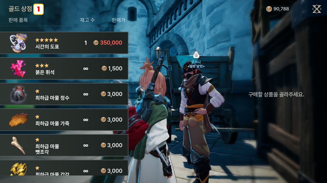 - 월드 곳곳에는 다양한 상점 NPC가 존재하며, 상인마다 판매하는 아이템과 요구하는 재화가 다릅니다.