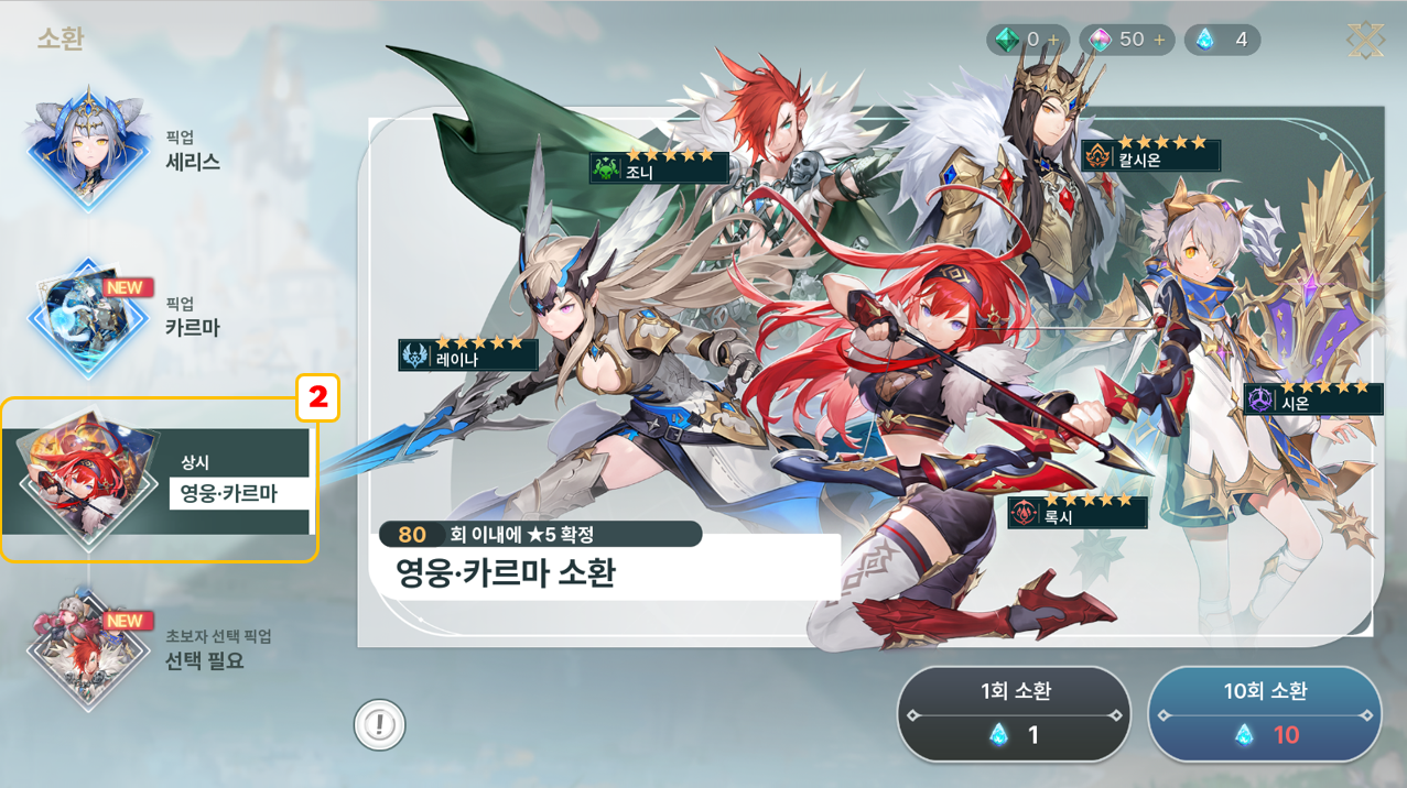 - 10회 소환 진행 시 ★4 등급 또는 그 이상의 영웅/카르마를 최소 1개 획득할 수 있습니다.