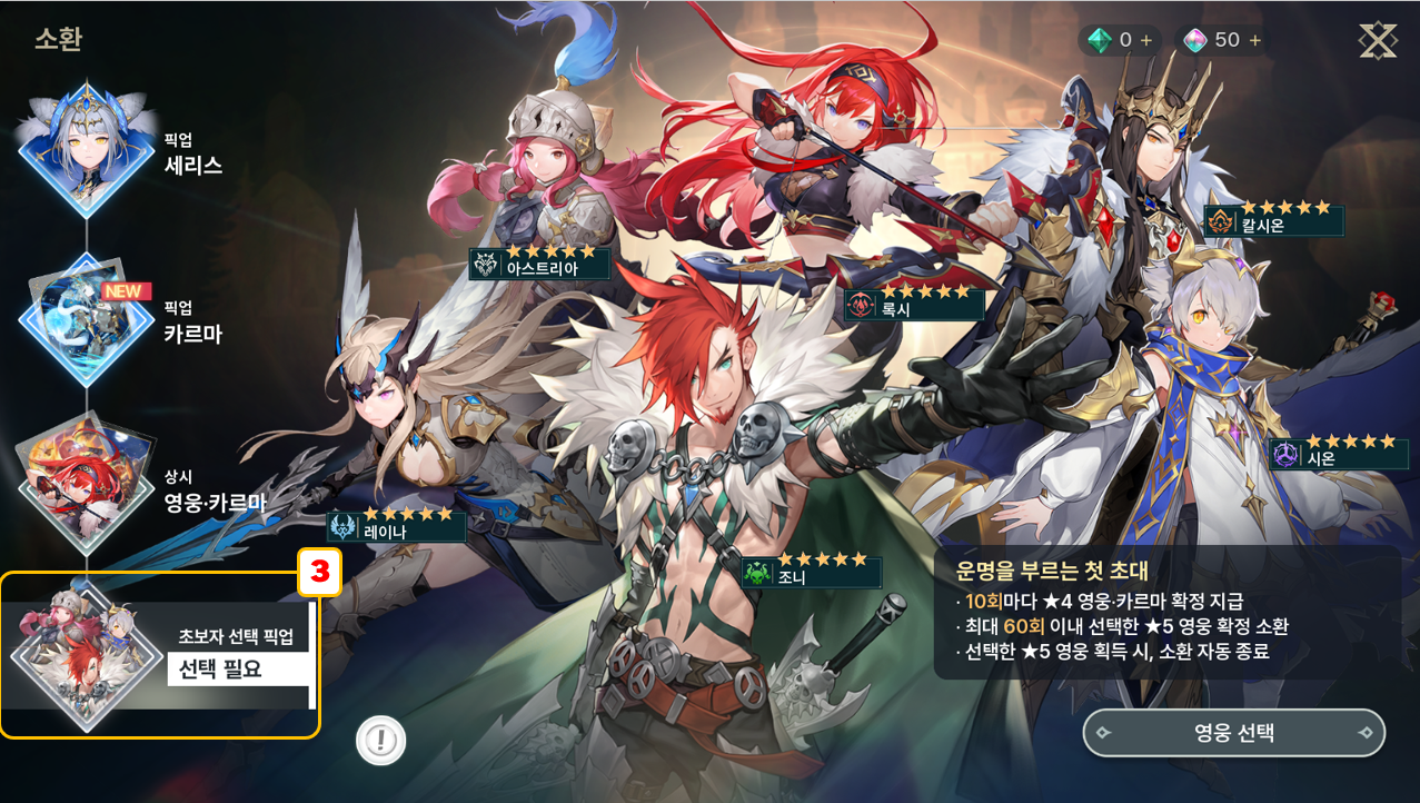 - 초보자 선택 픽업에서 획득한 영웅은 반드시 선택한 ★5 영웅으로 확정됩니다.